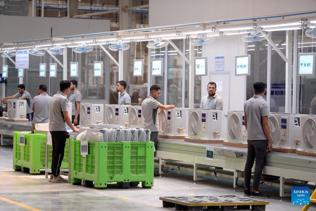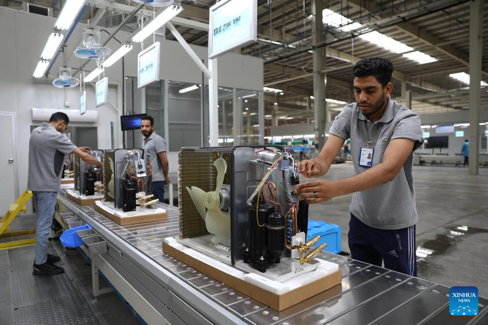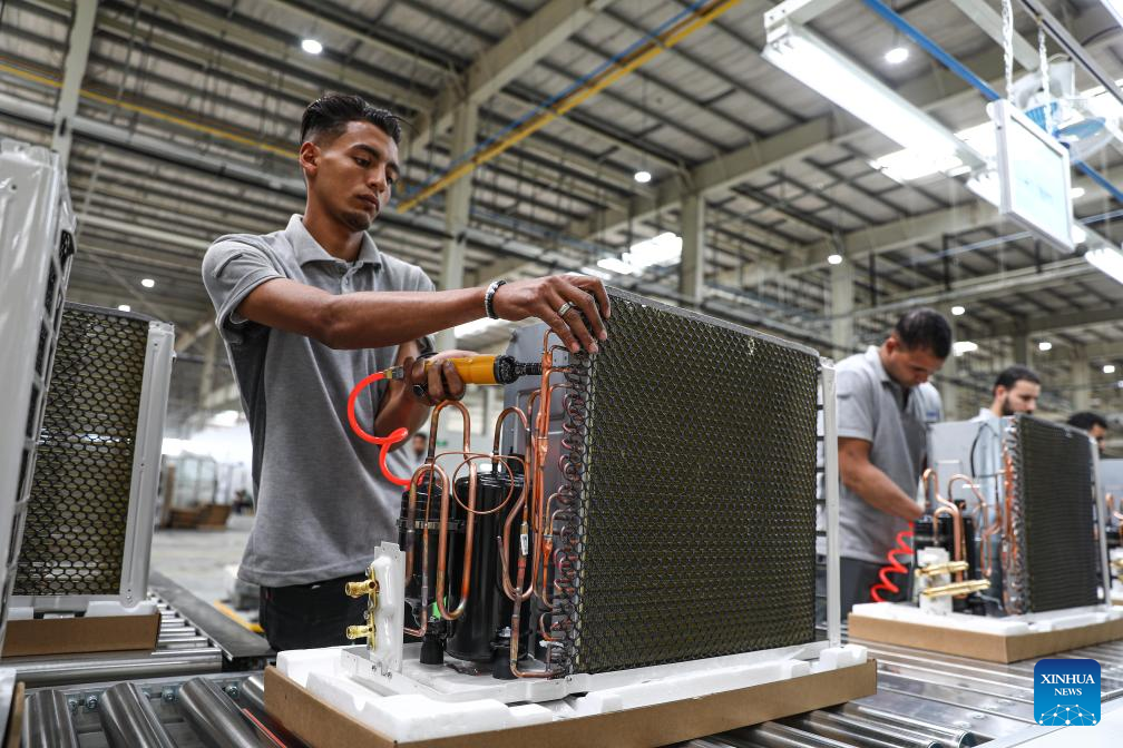 Laborers work on an air-conditioner production line at a factory of the Haier Egypt Ecological Park in the 10th of Ramadan City, Sharqia Province, Egypt, on May 1, 2024. China's home appliance giant Haier inaugurated Thursday its first industrial park in Egypt in 10th of Ramadan, a city northeast of Cairo. (Xinhua/Ahmed Gomaa)
