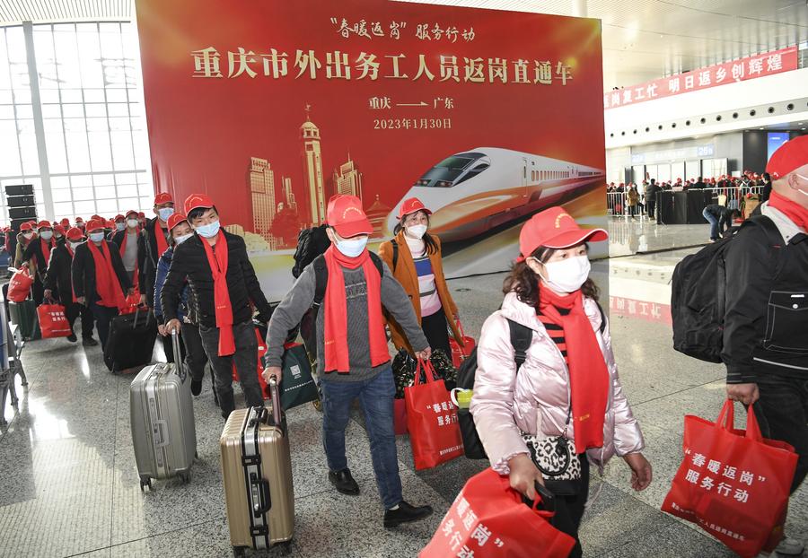 Migrant workers walk to the platform to get on the train D4881 at Chongqing West Railway Station in Chongqing, southwest China, Jan. 30, 2023. (Xinhua/Wang Quanchao)