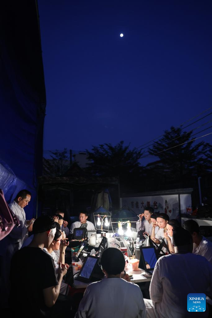 Chen Kehan (1st R) puts on makeup before performance at Lingmei Village in Haikou, south China's Hainan Province, May 2, 2024. Qiong Opera could be traced back to a century ago in Dingan County in this southern Chinese island, which is referred to as Qiong in abbreviation.(Xinhua/Zhang Liyun)