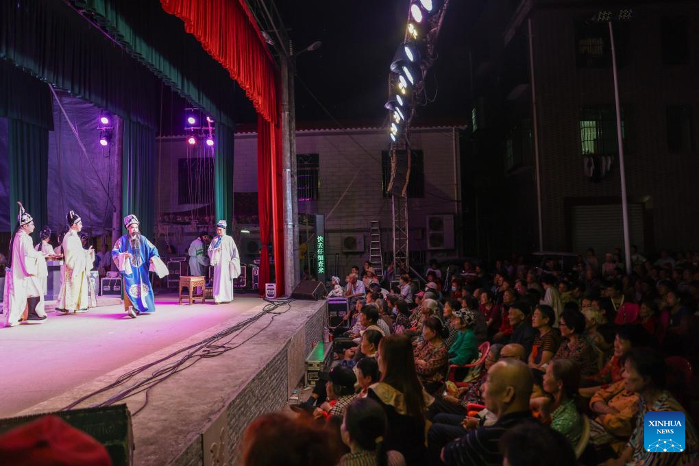 Residents watch a performance of Qiong Opera at Houshan Village, Dingan County, south China's Hainan Province, Feb. 21, 2024. Qiong Opera could be traced back to a century ago in Dingan County in this southern Chinese island, which is referred to as Qiong in abbreviation. (Xinhua/Zhang Liyun)