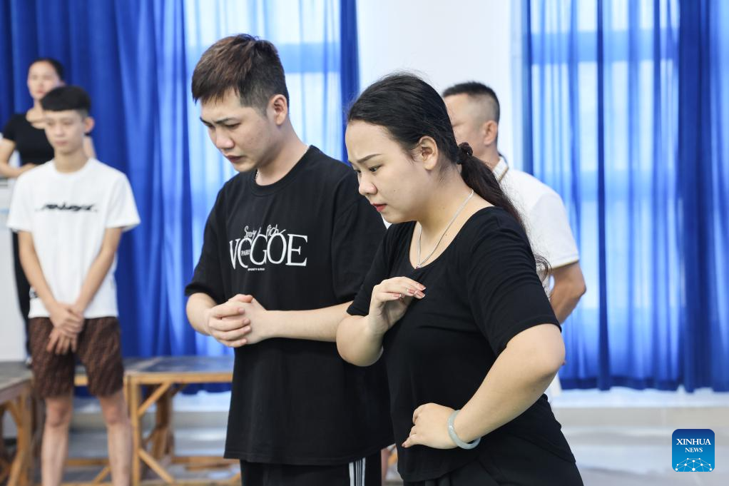 Chen Kehan (R) and his colleagues rehearse in Dingan County, south China's Hainan Province, April 24, 2024. Qiong Opera could be traced back to a century ago in Dingan County in this southern Chinese island, which is referred to as Qiong in abbreviation.(Xinhua/Zhang Liyun)