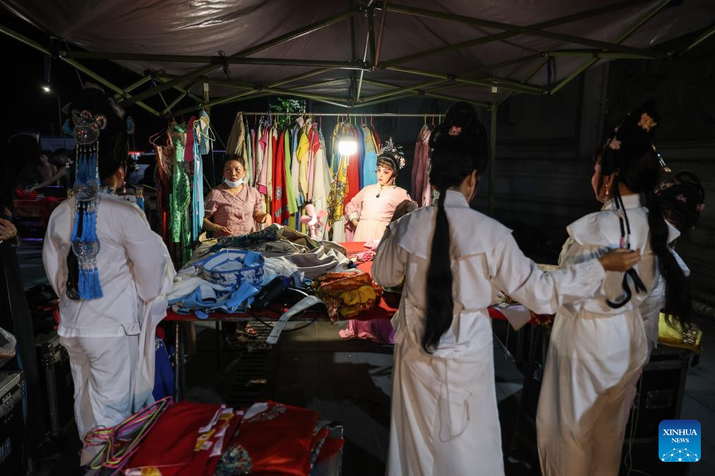Actors of the Dingan County Qiong Opera Troupe change their costumes at the back of the stage during a performance in Dingan County, south China's Hainan Province, April 23, 2024. Qiong Opera could be traced back to a century ago in Dingan County in this southern Chinese island, which is referred to as Qiong in abbreviation.(Xinhua/Zhang Liyun)
