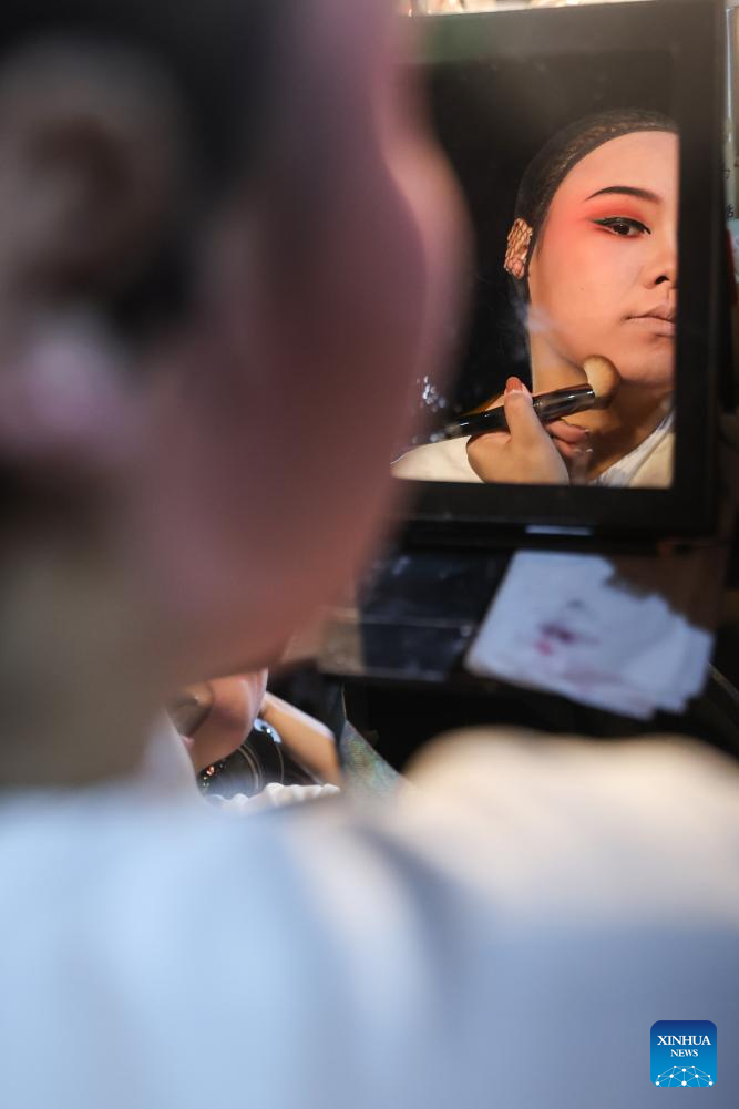 Lin Fang puts on makeup before performance at Dingan County, south China's Hainan Province, April 23, 2024. Qiong Opera could be traced back to a century ago in Dingan County in this southern Chinese island, which is referred to as Qiong in abbreviation.(Xinhua/Zhang Liyun)