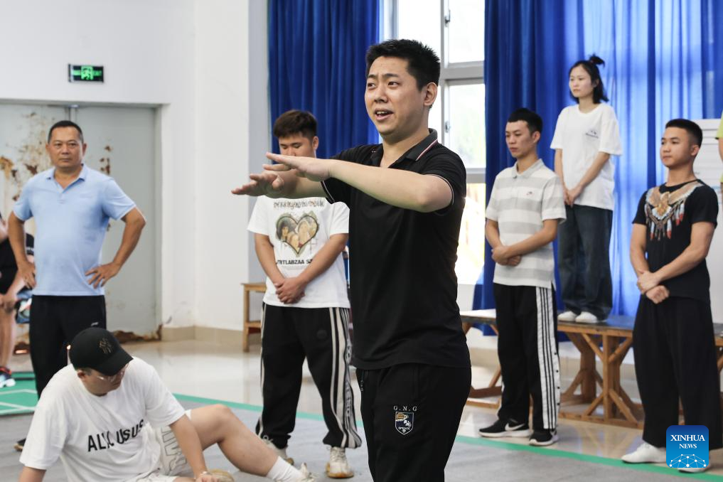 Chen Kehan (C front) and his colleagues rehearse as his father Chen Liubo (1st L) looks on in Dingan County, south China's Hainan Province, April 24, 2024. Qiong Opera could be traced back to a century ago in Dingan County in this southern Chinese island, which is referred to as Qiong in abbreviation.(Xinhua/Zhang Liyun)