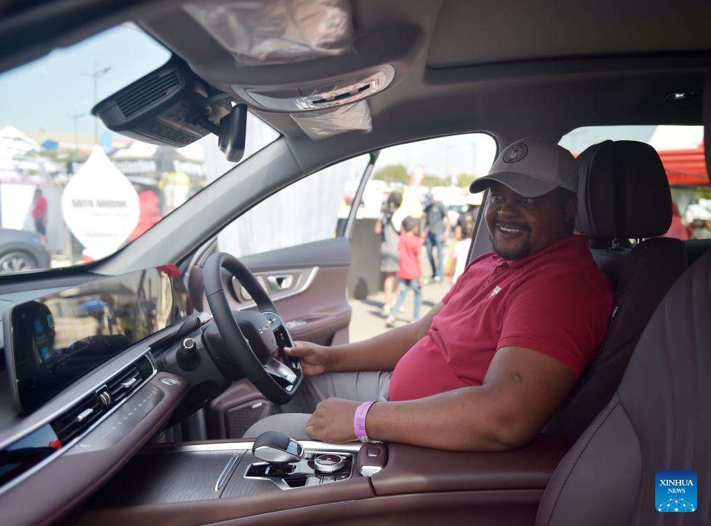 Isaac Pheko, a Botswana motorist journalist, sits in a Chery Tiggo 8 Pro Max during the 9th edition of the Shell Gaborone Motor Show in Gaborone, the Botswanan capital, May 3, 2024. (Photo by Tshekiso Tebalo/Xinhua)