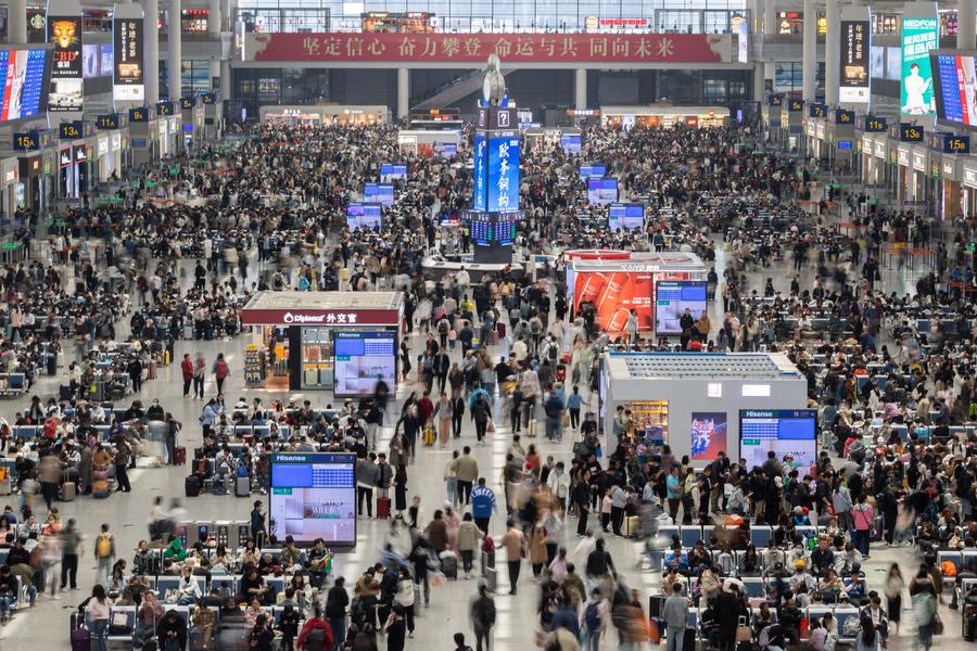 Passengers are seen at the waiting hall of Shanghai Hongqiao Railway Station in east China's Shanghai, May 1, 2024. (Xinhua/Wang Xiang)