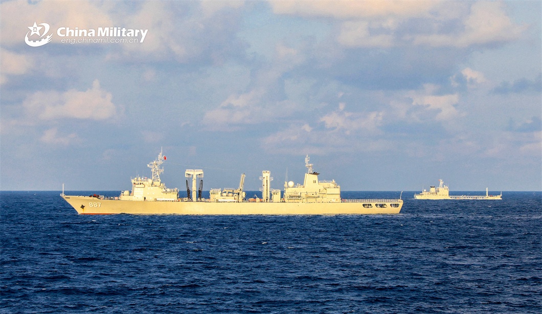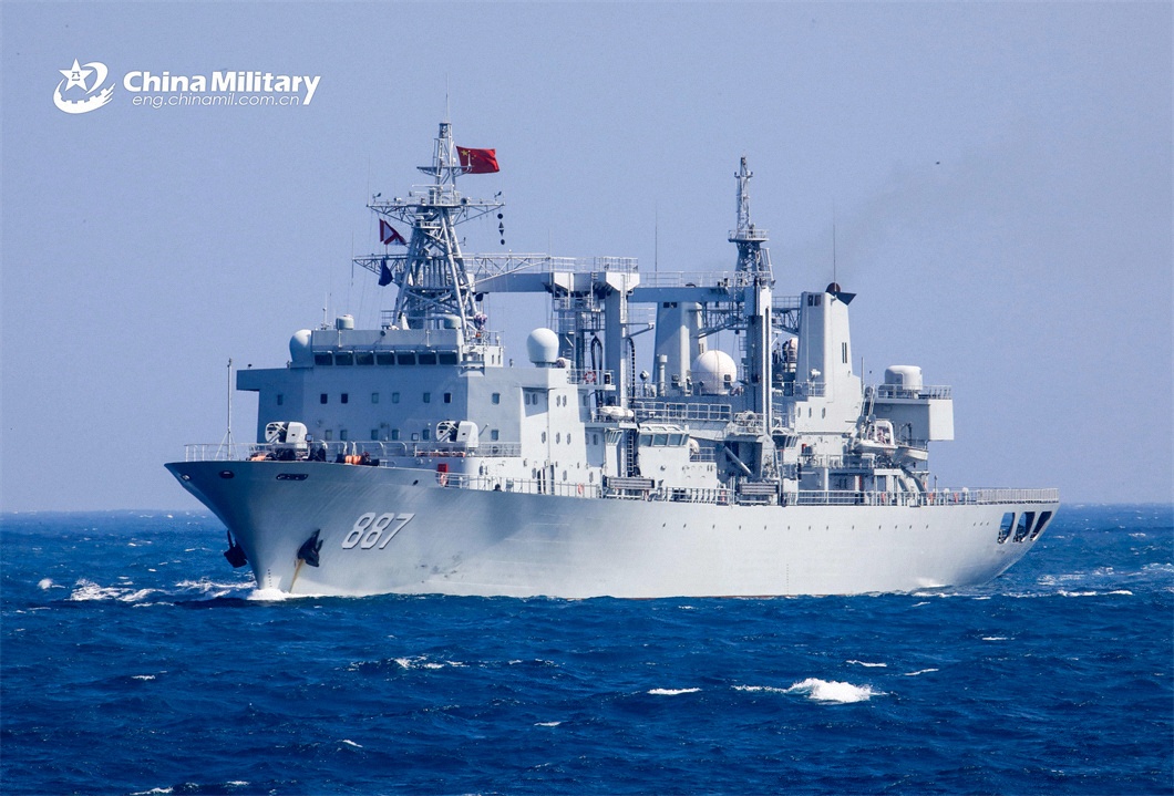 The comprehensive supply ship Weishanhu (Hull 887) attached to a service ship group of the PLA Navy sails on the sea during a combat training exercise in late March, 2024. (eng.chinamil.com.cn/Photo by Wu Huanqing)