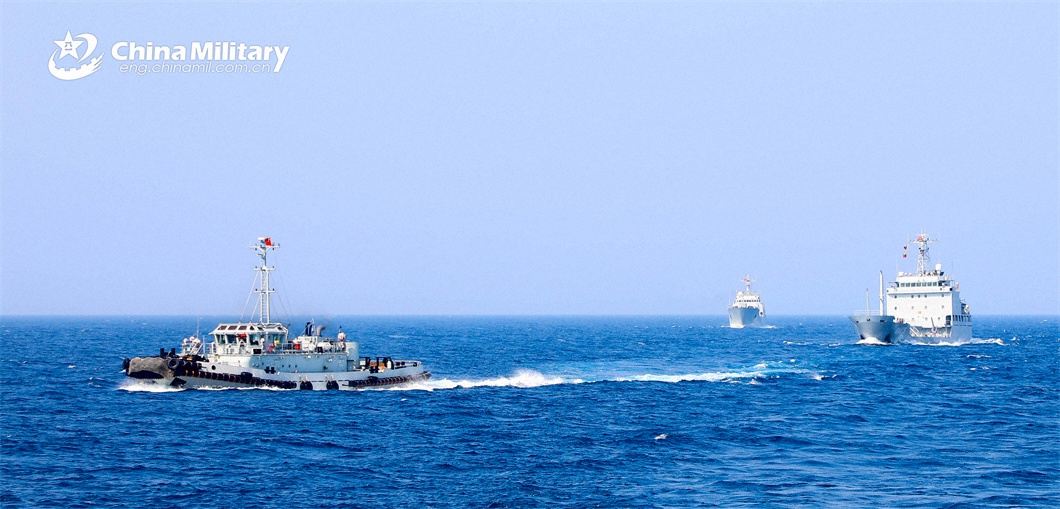 Warships attached to a service ship group of the PLA Navy sail in formation during a combat training exercise in late March, 2024. (eng.chinamil.com.cn/Photo by Wu Huanqing)