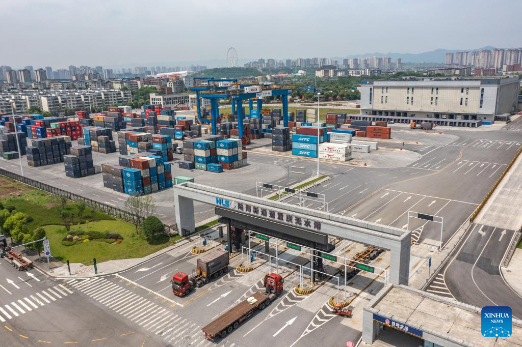 An aerial drone photo taken on May 5, 2024 shows trucks running at the dry port of the New International Land-Sea Trade Corridor in southwest China's Chongqing Municipality. The Chongqing International Logistics Hub Park, which includes the Tuanjiecun Station, the dry port of the New International Land-Sea Trade Corridor, and the Chongqing Railway Port, has risen to be a major hub of international freight trains in the country's western region. (Xinhua/Huang Wei)