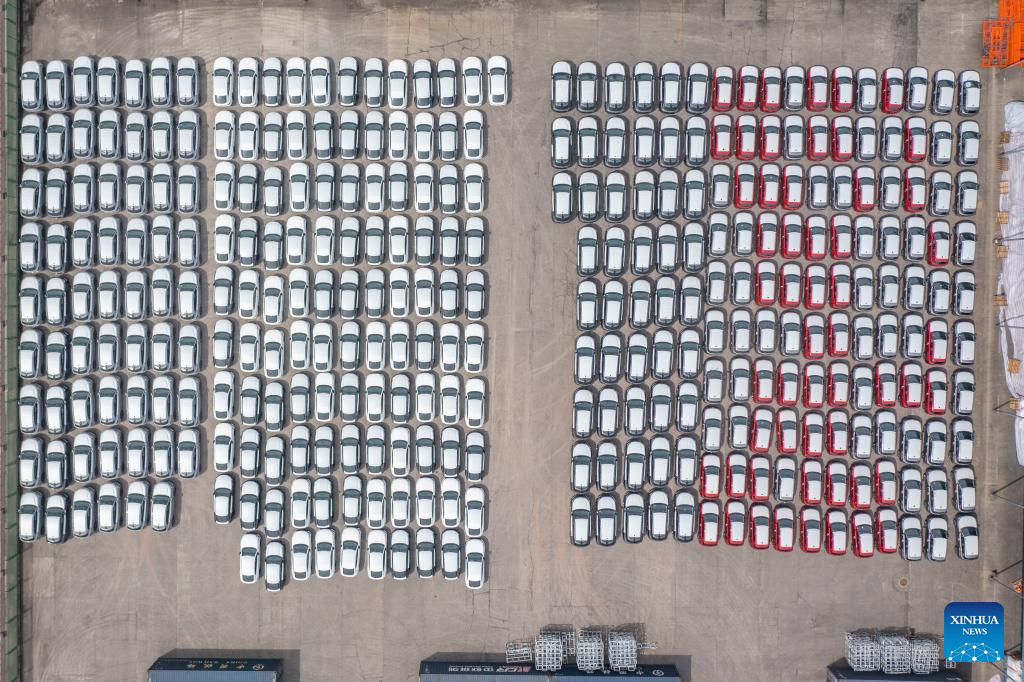 An aerial drone photo taken on May 5, 2024 shows cars waiting to be loaded at the Tuanjiecun Station in the Chongqing International Logistics Hub Park in southwest China's Chongqing Municipality. The Chongqing International Logistics Hub Park, which includes the Tuanjiecun Station, the dry port of the New International Land-Sea Trade Corridor, and the Chongqing Railway Port, has risen to be a major hub of international freight trains in the country's western region. (Xinhua/Huang Wei)