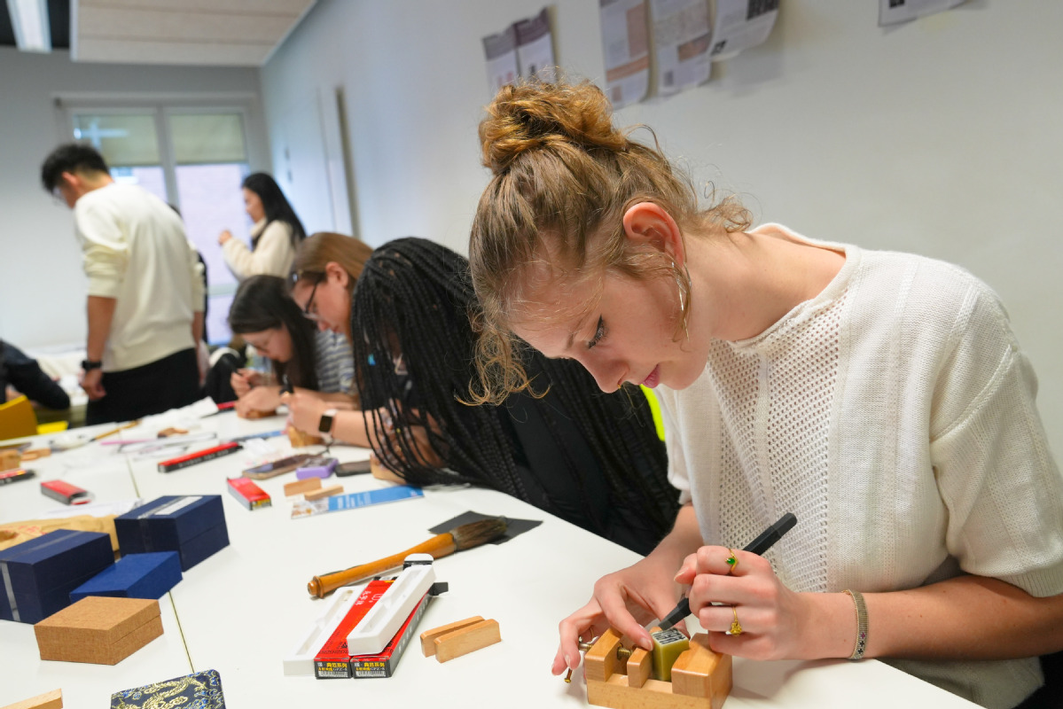 On Thursday, students from five French institutions of higher education and middle schools experienced seal carving under the instruction of professors and students from East China Normal University.