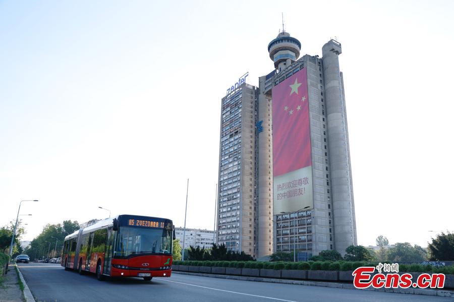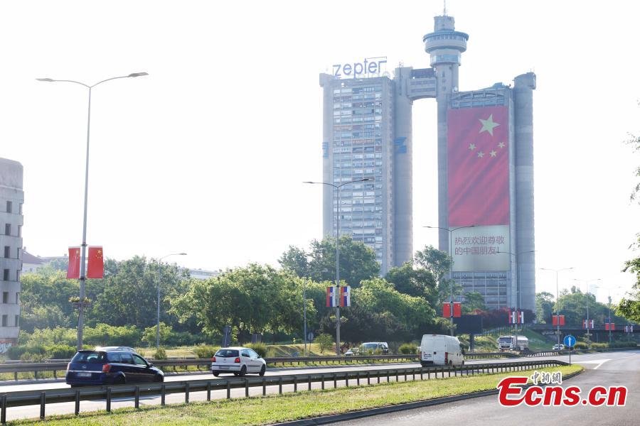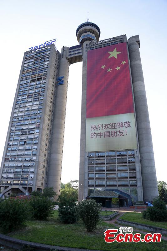A giant Chinese national flag and a poster reading "A warm welcome to our distinguished Chinese friends" are displayed on the Genex tower ahead of a state visit by Chinese President Xi Jinping, in Belgrade, Serbia, May 5, 2024. (Photo: China News Service/Han Haidan)