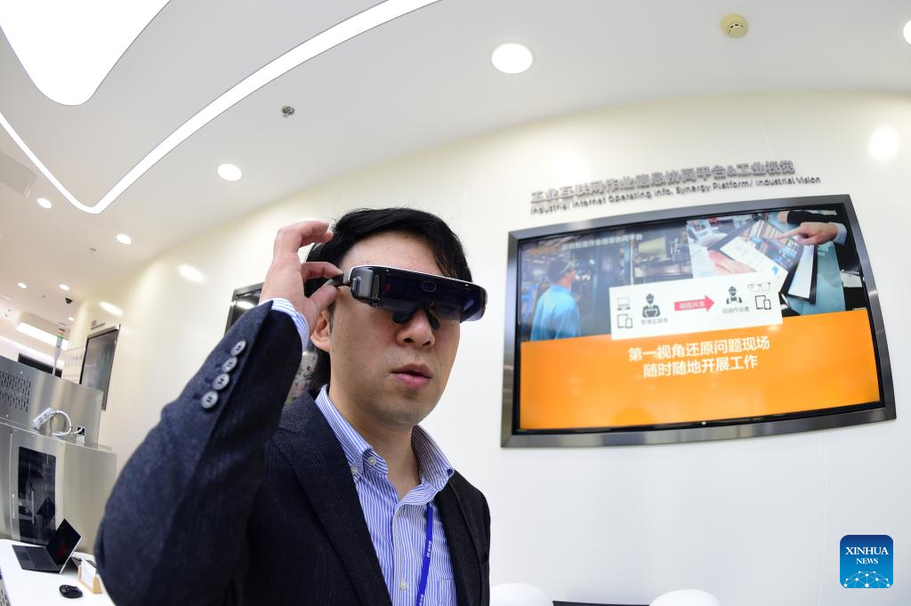 An engineer demonstrates a remote communication via VR glasses at DHC, an IT company to provide application software products, in Dalian, northeast China's Liaoning Province, April 25, 2024. In recent years, Liaoning Province has actively fostered an environment conducive to the development of the software industry and nurtured clusters of software enterprises. (Xinhua/Yang Qing)