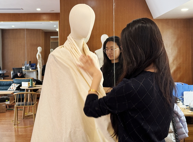 A designer from a Hanfu research institute in Luoyang works on a design to be displayed at the China Fashion Week A/W 2024 in Beijing, capital of China. (Photo/Zhang Wenqi)