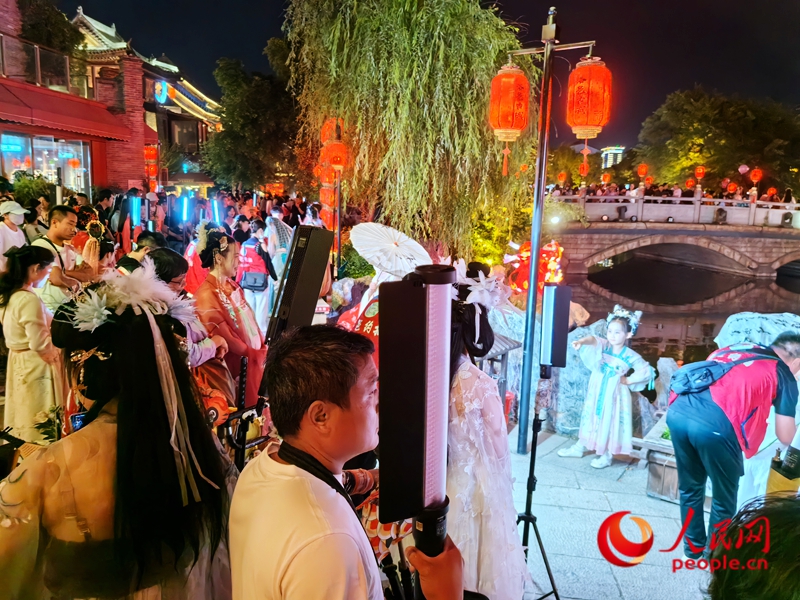 In the evening, the ancient city of Luoyi, a tourist attraction in Luoyang, comes alive with long lines of tourists dressed in Hanfu, eager for photo opportunities. (People's Daily Online/Wang Pei)