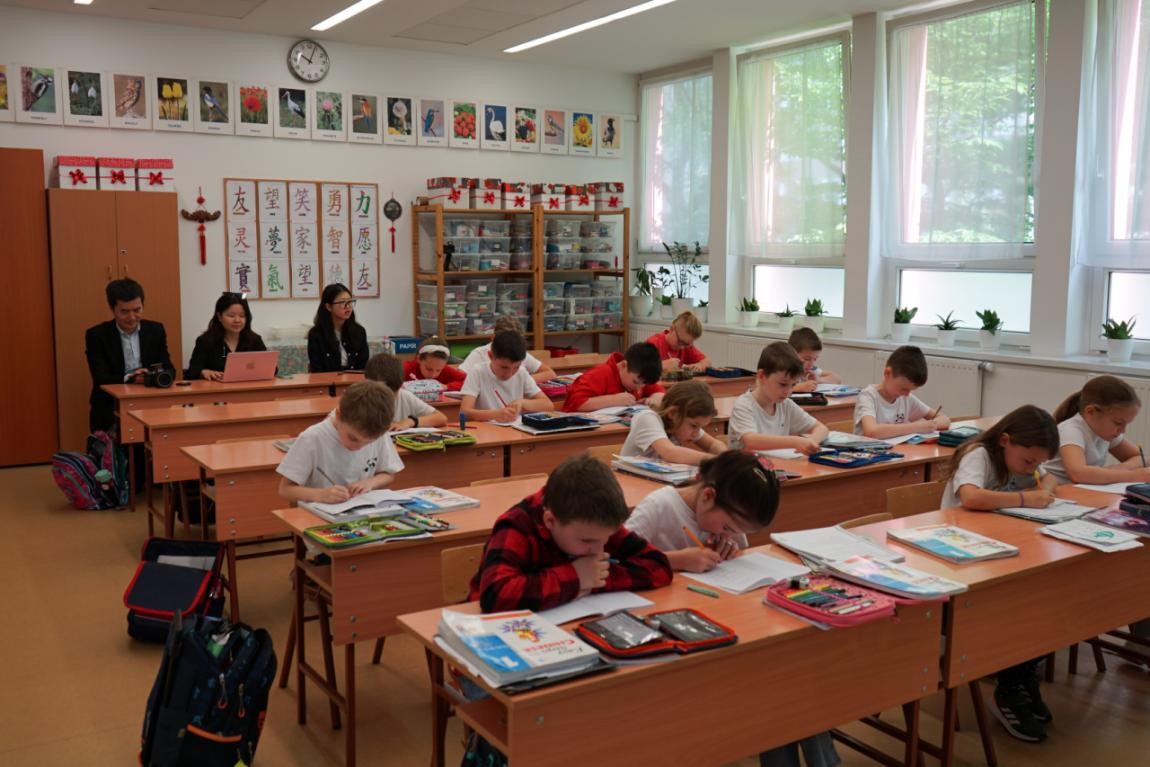 Second-grade students of the Hungarian-Chinese bilingual school take dictation in a Chinese language class in April, 2024. (Photo/Yi Lin)