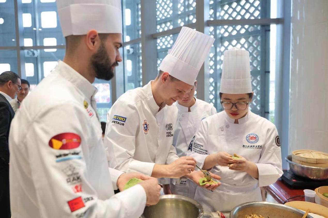"Amazing Chinese Tastes--West Lake Banquet" Chinese Food Culture Exhibition was held at the China Cultural Center in Belgrade, Serbia on April 11, 2024. Teachers and students at the Tourism College of Zhejiang and trainees of the Serbian Luban Workshop jointly make qingtuan, a green-colored dumpling made of glutinous rice mixed with Chinese mugwort or barley grass. (Photo provided by the China Cultural Center in Belgrade)