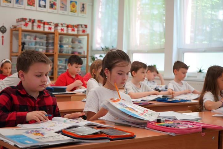 Second-grade students of the Hungarian-Chinese bilingual school in Budapest, Hungary have a Chinese language class. (Photo/Yi Lin)