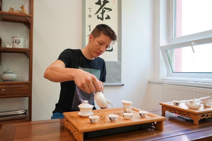 Tenth-grade student Erd?s Artúr of the Hungarian-Chinese bilingual school in Budapest, Hungary has a Chinese tea culture class. (Photo/Yi Lin)