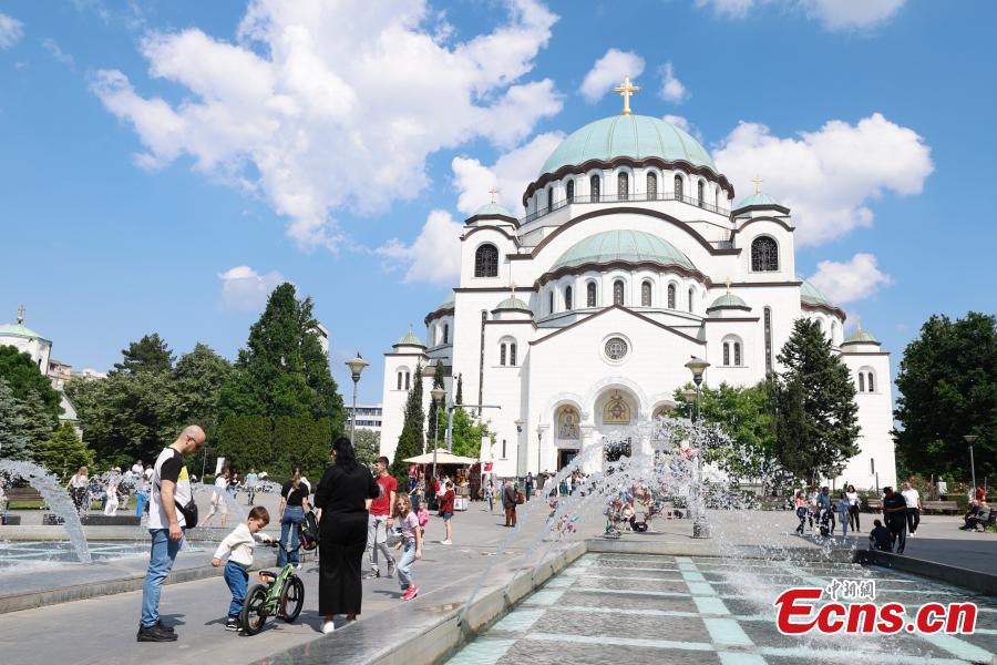 Kids play in front of the Church of Saint Sava in Belgrade, Serbia, May 6, 2024. (Photo: China News Service/Han Haidan)