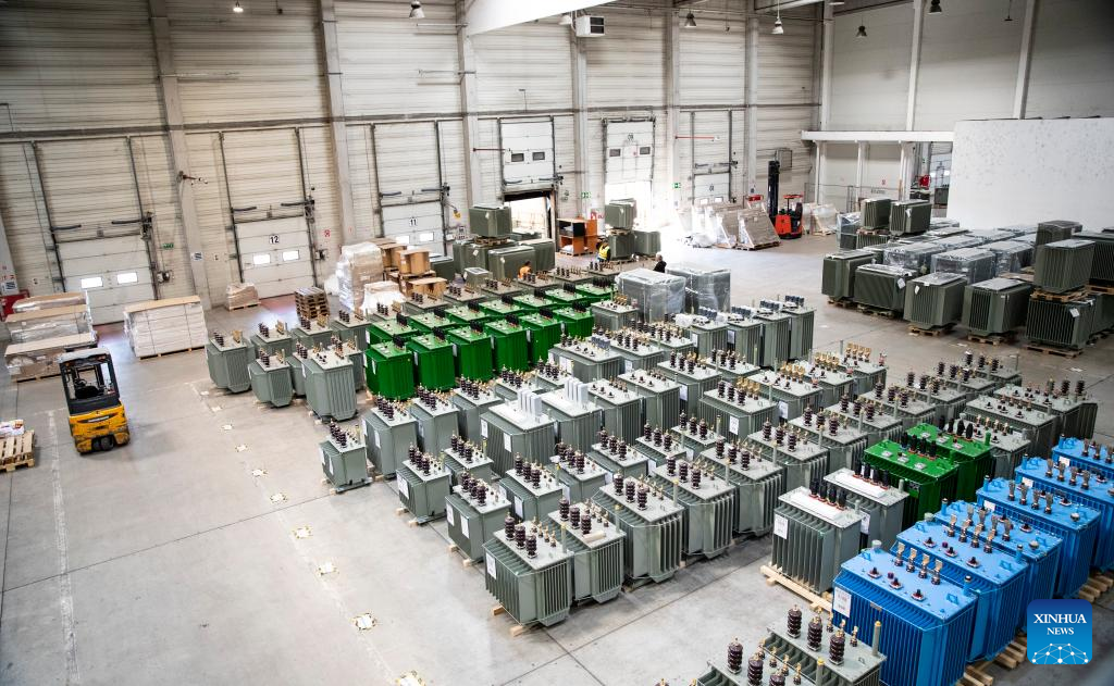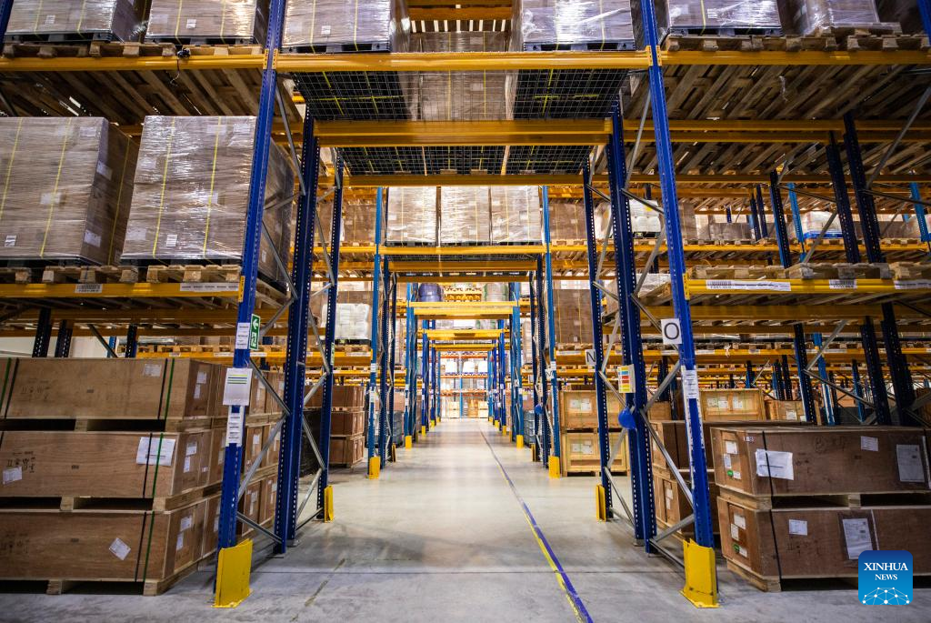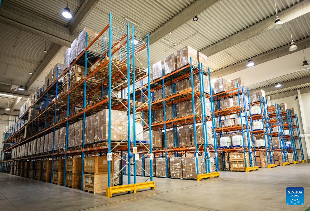This photo taken on April 29, 2024 show a storehouse at Csepel Freeport Logistics Park of the Central European Trade and Logistics Cooperation Zone in Budapest, Hungary. Founded in 2012, the Central European Trade and Logistics Cooperation Zone (CECZ) is a major trade hub that facilitates trade cooperation between Hungarian and Chinese companies and also between China and the other countries of Central and Eastern Europe (CEEC). (Xinhua/Zhang Fan)