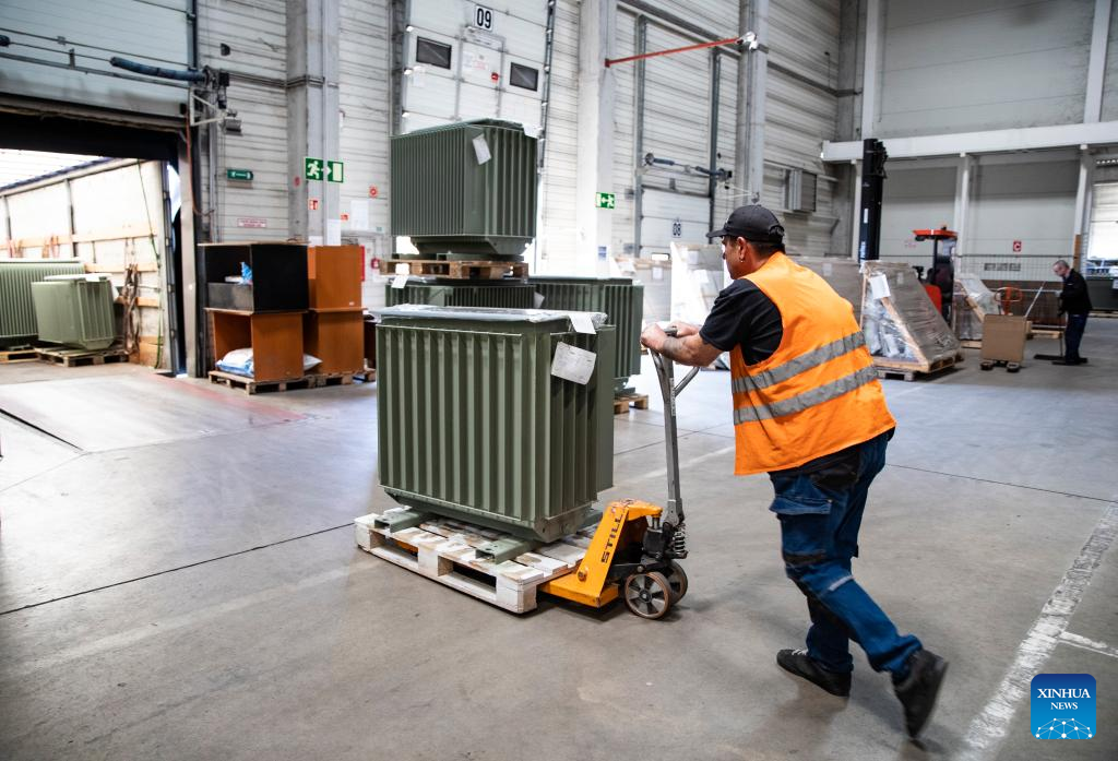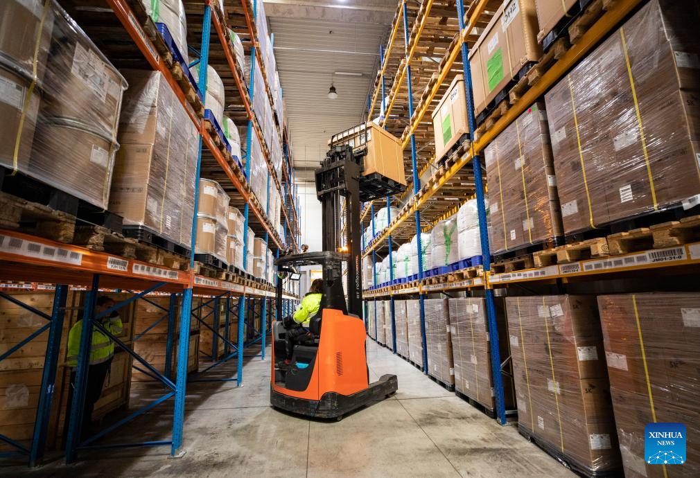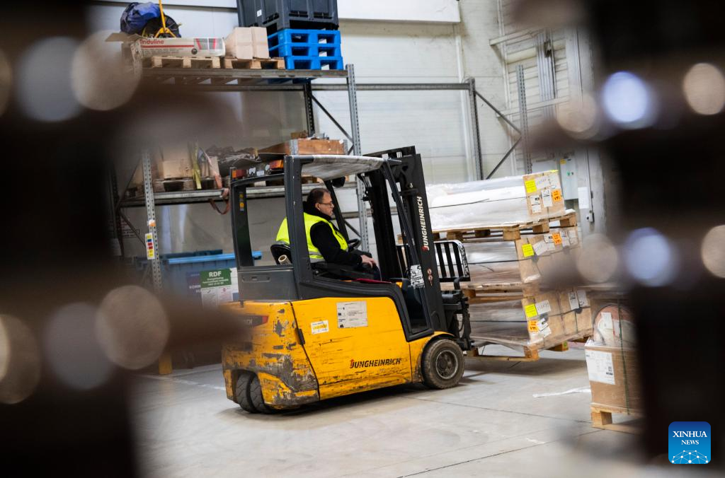A worker moves goods at the Csepel Freeport Logistics Park of the Central European Trade and Logistics Cooperation Zone in Budapest, Hungary on April 29, 2024. Founded in 2012, the Central European Trade and Logistics Cooperation Zone (CECZ) is a major trade hub that facilitates trade cooperation between Hungarian and Chinese companies and also between China and the other countries of Central and Eastern Europe (CEEC). (Xinhua/Zhang Fan)