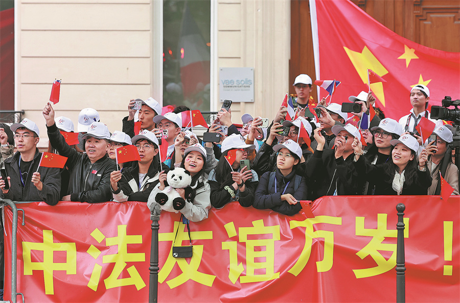 Overseas Chinese hold up flags and cheer for President Xi's state visit to France in Paris on Sunday. FENG YONGBIN/CHINA DAILY