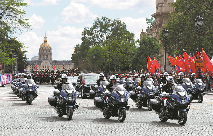 President Xi Jinping and his wife, Peng Liyuan, are escorted by French guards as they head to the Elysee Palace after they attended a welcome ceremony in Paris on Monday. GAO JING/XINHUA