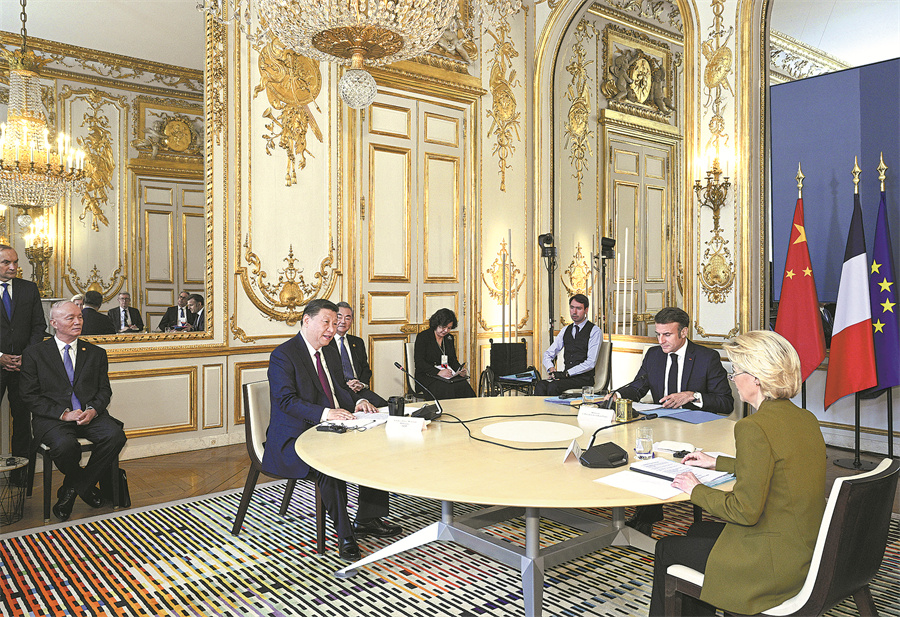 President Xi Jinping attends a China-France-EU trilateral meeting with French President Emmanuel Macron and European Commission President Ursula von der Leyen at the Elysee Palace in Paris on Monday. LI XUEREN/XINHUA