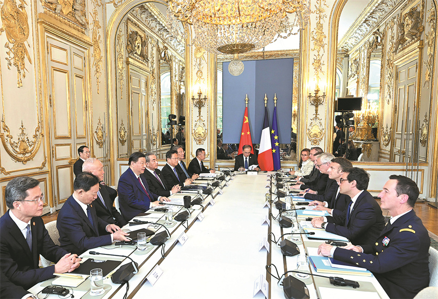President Xi Jinping talks with French President Emmanuel Macron during a meeting at the Elysee Palace in Paris on Monday. YIN BOGU/XINHUA