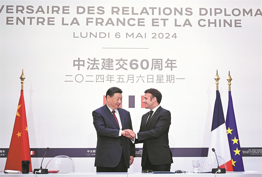 President Xi Jinping shakes hands with French President Emmanuel Macron during a joint news conference at the Elysee Palace in Paris on Monday. LI XUEREN/XINHUA