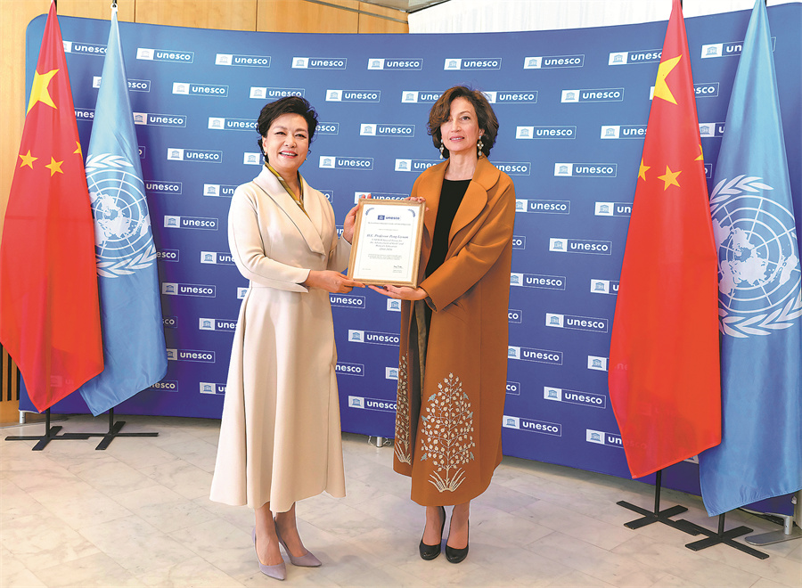The United Nations Educational, Scientific and Cultural Organization Director-General Audrey Azoulay presents Peng Liyuan, a UNESCO special envoy for the advancement of girls' and women's education, with a 10-year service honor certificate in Paris on Monday. YUE YUEWEI/XINHUA