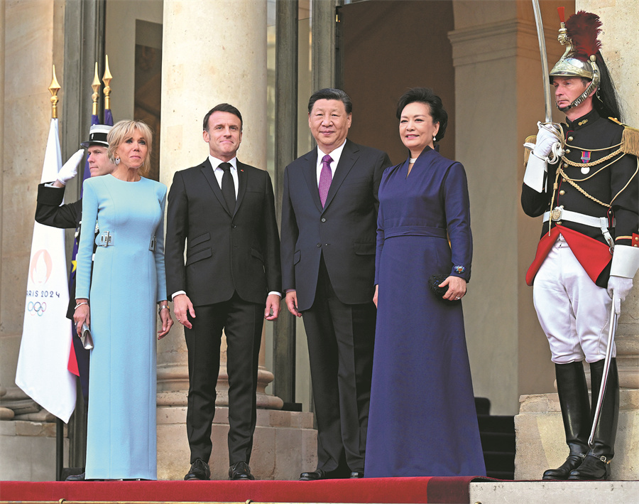 President Xi Jinping and his wife, Peng Liyuan, attend a welcome banquet held by French President Emmanuel Macron and his wife, Brigitte Macron, at the Elysee Palace in Paris on Monday. LI XUEREN/XINHUA