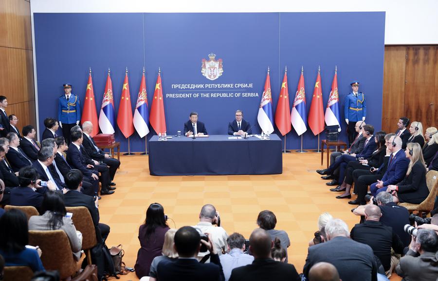 BELGRADE, May 8 (Xinhua) -- Chinese President Xi Jinping and Serbian President Aleksandar Vucic on Wednesday jointly met the press after their talks in Belgrade, Serbia.