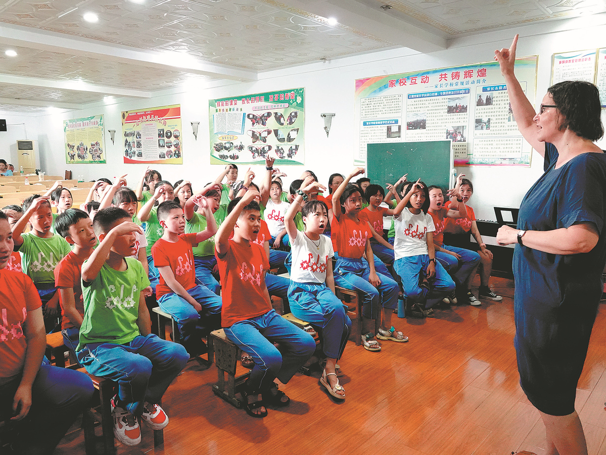 Edit Lanczky, a Hungarian music teacher, gives a choir lesson to students at a primary school in Anren county, Hunan province, in August 2020. CHINA DAILY