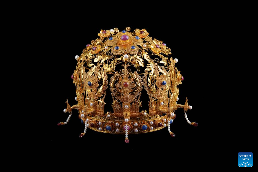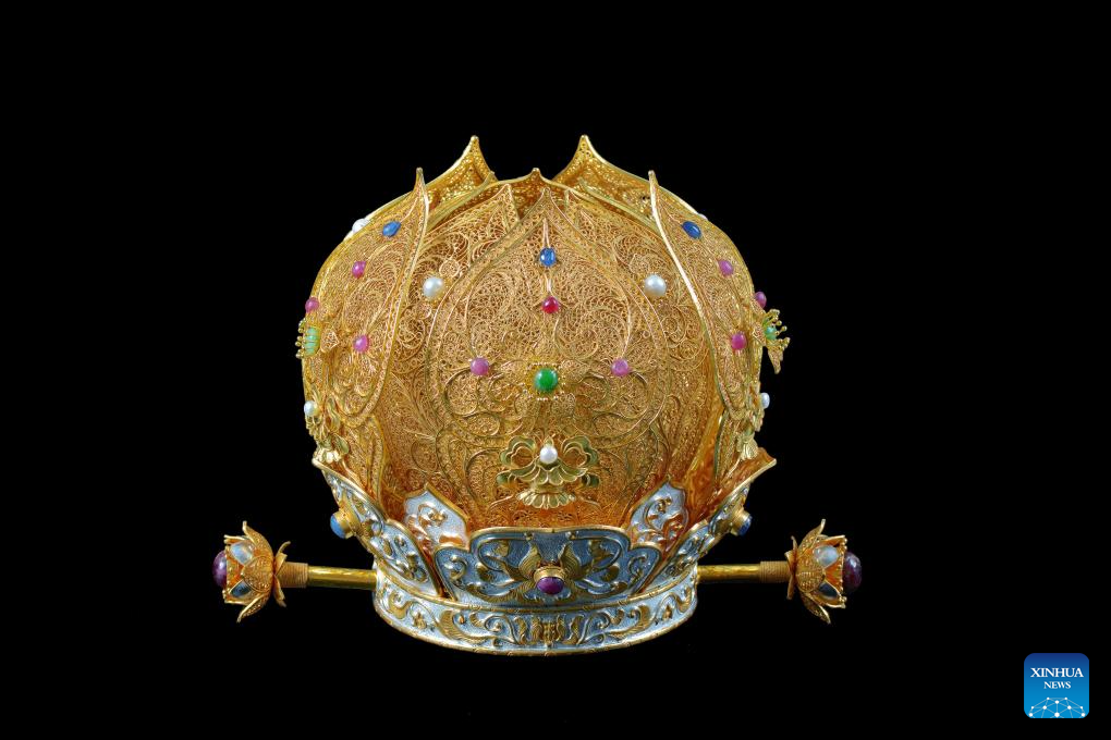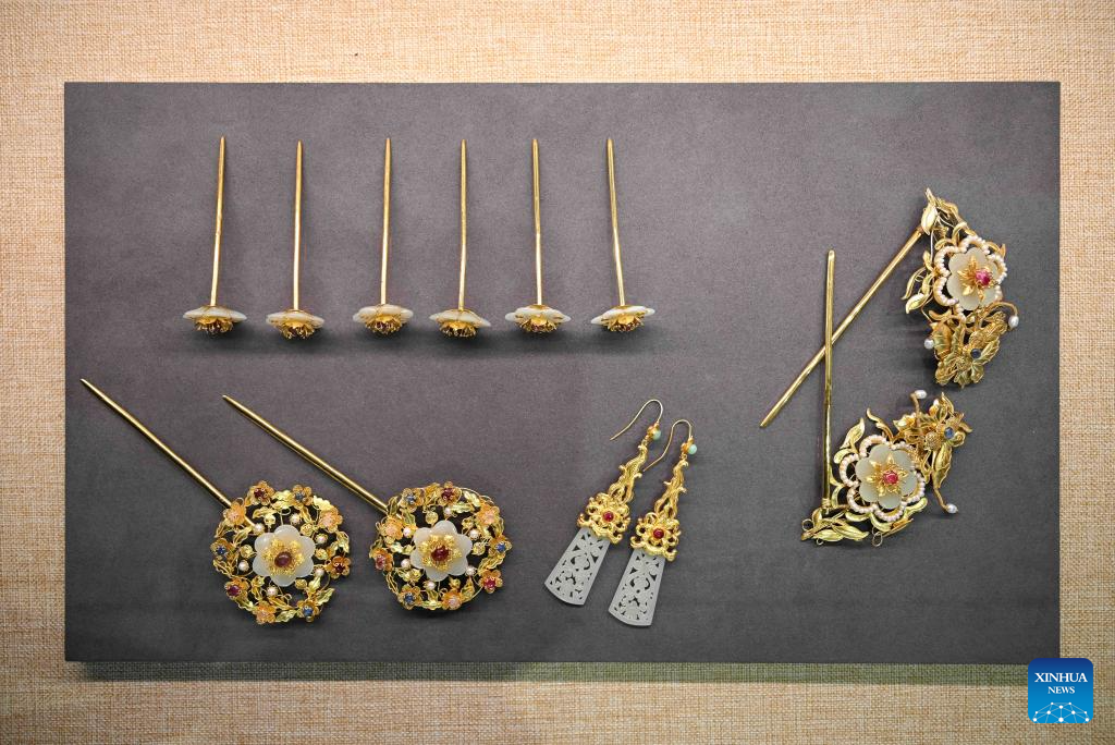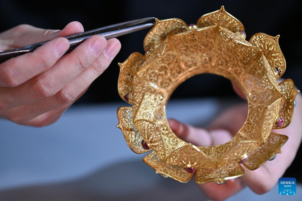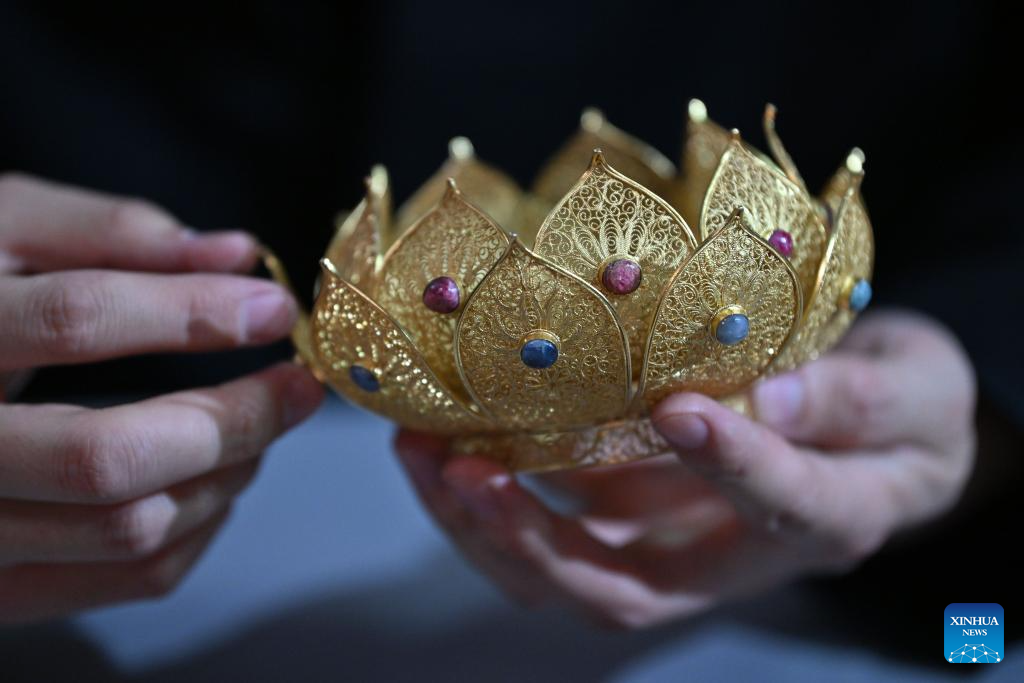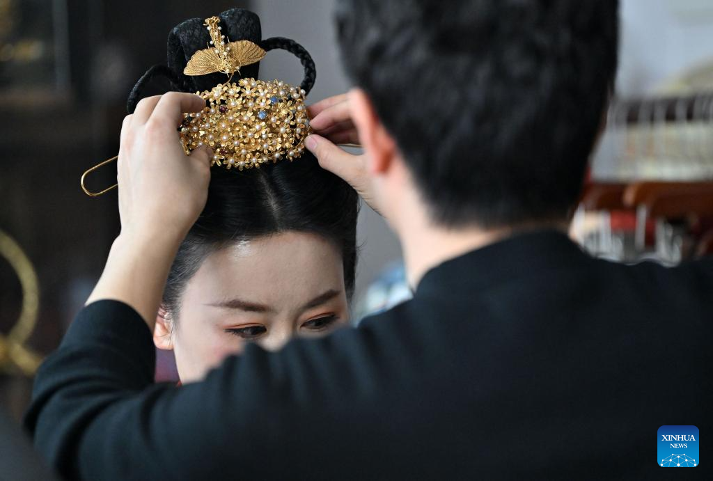 An enthusiast for Hanfu tries a head decoration of filigree mosaic at a studio in Tianjin, north China, March 7, 2024. (Xinhua/Sun Fanyue)