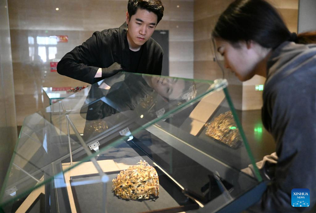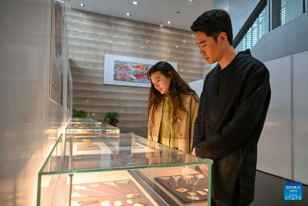 Ma Sai (R) and his girlfriend Min Fangping watch filigree mosaic artworks they made displayed at Wuqing museum in Tianjin, north China, March 23, 2024. (Xinhua/Sun Fanyue)