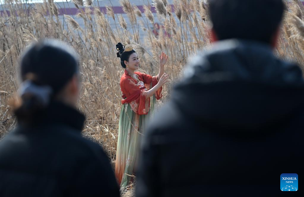 Ma Sai (R, back) and his girlfriend Min Fangping (L, back) watch a Hanfu enthusiast posing for photos in Tianjin, north China, March 7, 2024. (Xinhua/Li Ran)