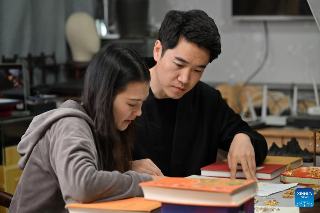 Ma Sai (R) talks with his girlfriend Min Fangping on filigree mosaic design patterns at his studio in Liuzhuang Village of Wuqing District of Tianjin, north China, March 19, 2024. (Xinhua/Li Ran)