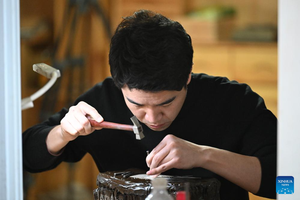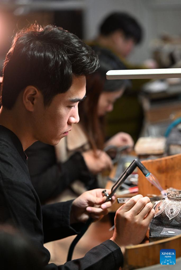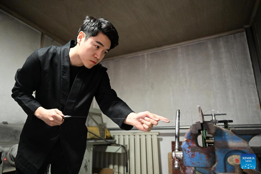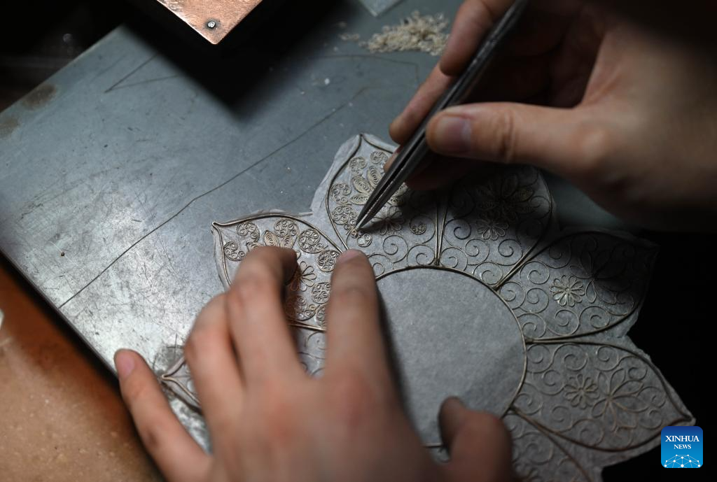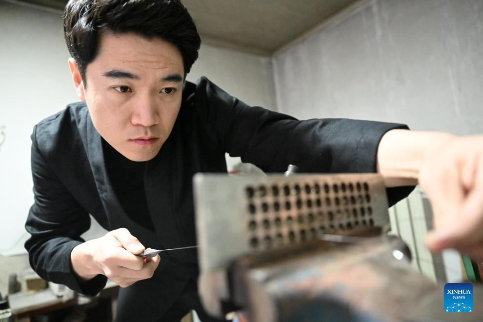 Ma Sai makes a filigree mosaic artwork at his studio in Liuzhuang Village of Wuqing District of Tianjin, north China, March 19, 2024. (Xinhua/Zhao Zishuo)