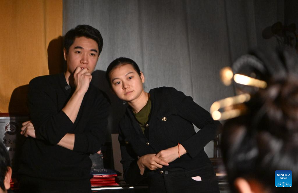Ma Sai (L) and his girlfriend Min Fangping arrange filigree mosaic artworks before a show themed on Ma's Filigree Mosaic art at Wuqing museum in Tianjin, north China, March 19, 2024. (Xinhua/Zhao Zishuo)