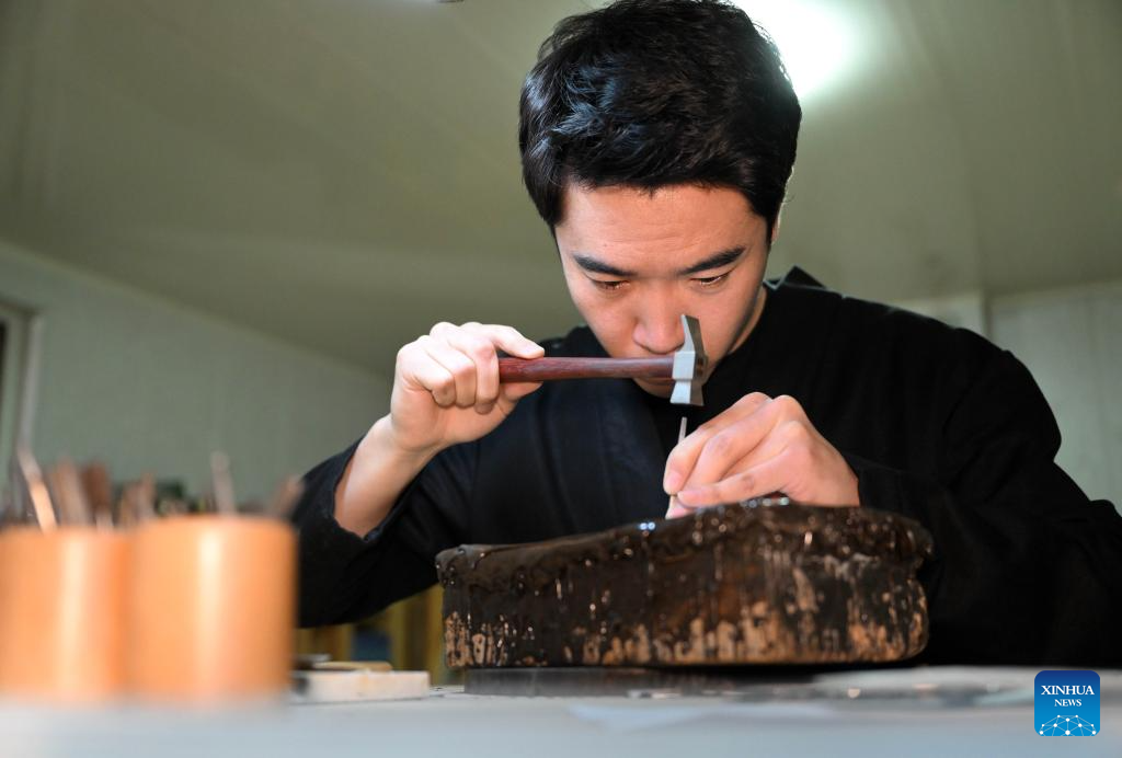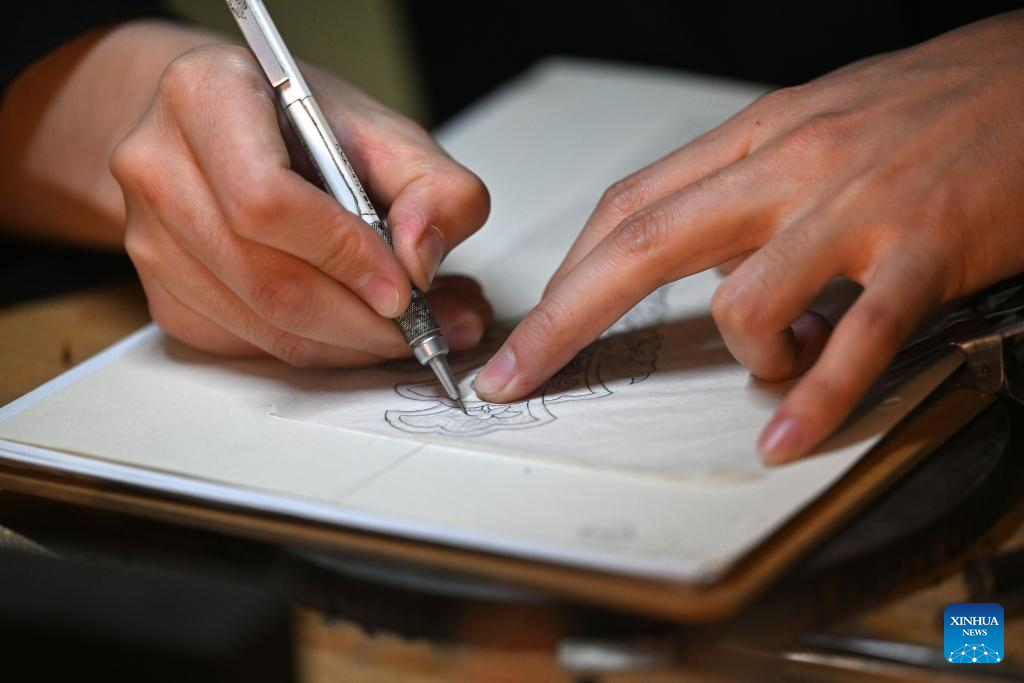 Ma Sai draws patterns for a filigree mosaic artwork at his studio in Liuzhuang Village of Wuqing District of Tianjin, north China, March 19, 2024. (Xinhua/Li Ran)