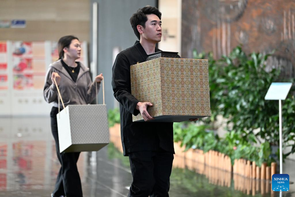 Ma Sai (R) and his girlfriend Min Fangping carry filigree mosaic artworks before a show themed on Ma's Filigree Mosaic art at Wuqing museum in Tianjin, north China, March 19, 2024. (Xinhua/Li Ran)