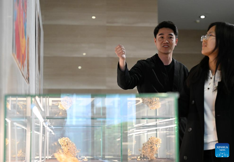 Ma Sai introduces to a visitor during a show themed on Ma's Filigree Mosaic art at Wuqing museum in Tianjin, north China, March 23, 2024. (Xinhua/Zhao Zishuo)