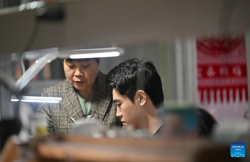 Ma Sai (R) talks with his mother on filigree mosaic art at his studio in Liuzhuang Village of Wuqing District of Tianjin, north China, March 19, 2024. (Xinhua/Li Ran)