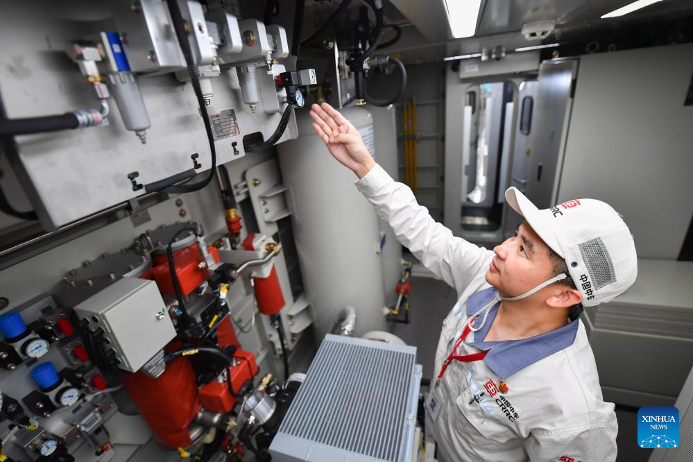 A worker inspects an intelligent heavy-haul electric locomotive in Zhuzhou, central China's Hunan Province, May 9, 2024. An intelligent heavy-haul electric locomotive officially rolled off the production line in Zhuzhou on Thursday. It will be used in the heavy-haul transportation of Shuozhou-Huanghua Railway, China's second-largest channel for coal transport. (Xinhua/Chen Zeguo)