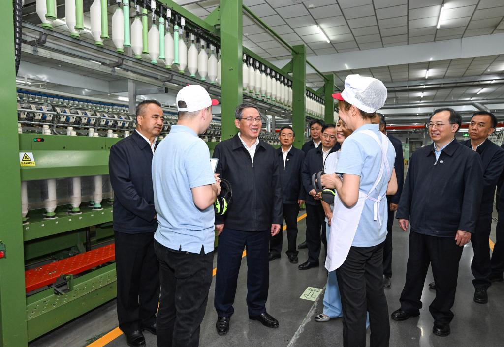 Chinese Premier Li Qiang, also a member of the Standing Committee of the Political Bureau of the Communist Party of China Central Committee, visits a local company in northwest China's Xinjiang Uygur Autonomous Region, May 8, 2024. Li made an inspection tour in Xinjiang from Tuesday to Thursday. (Xinhua/Rao Aimin)