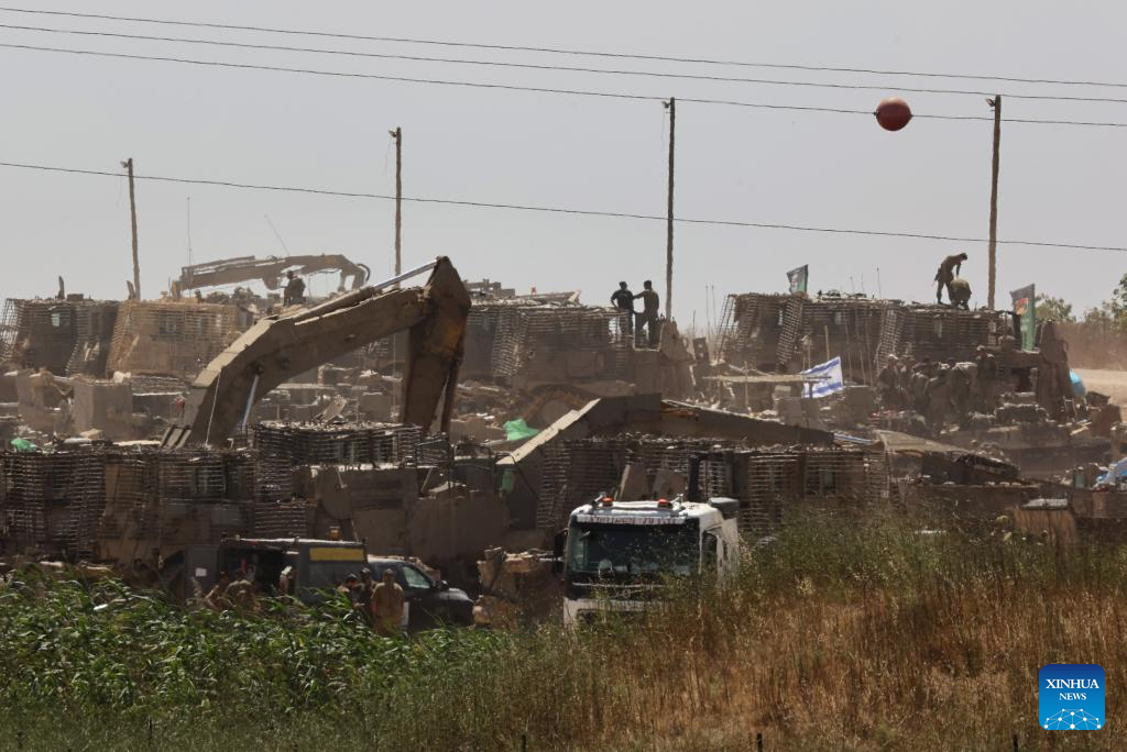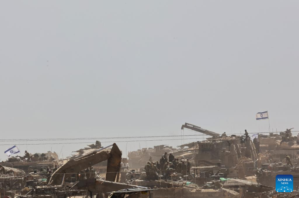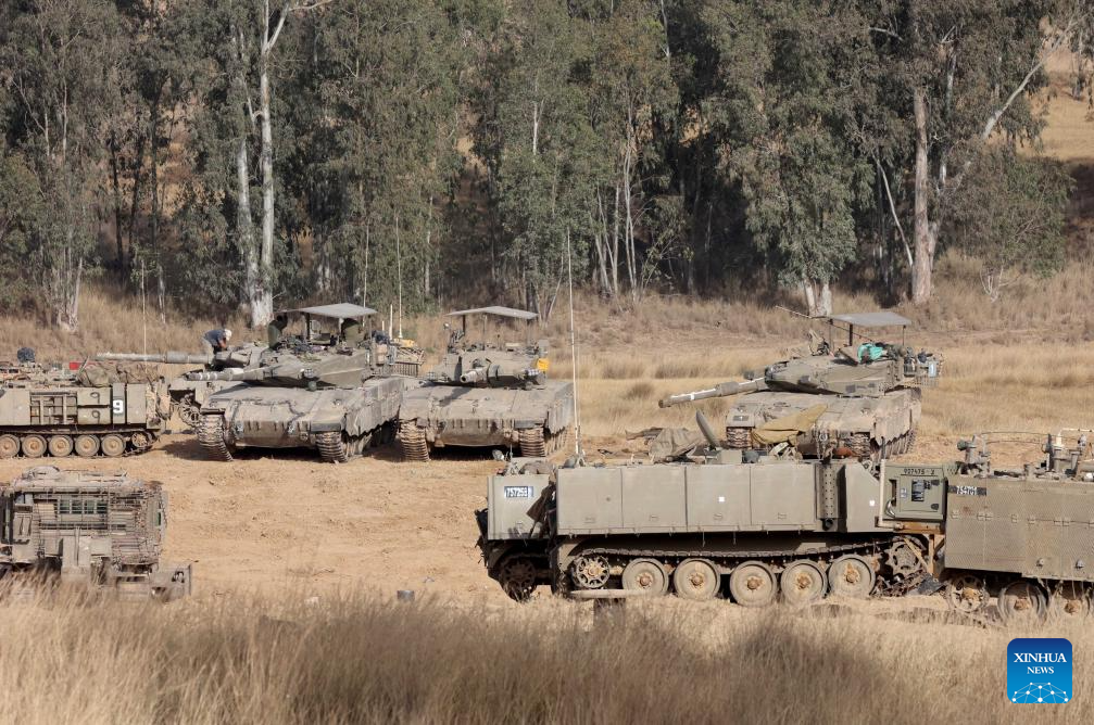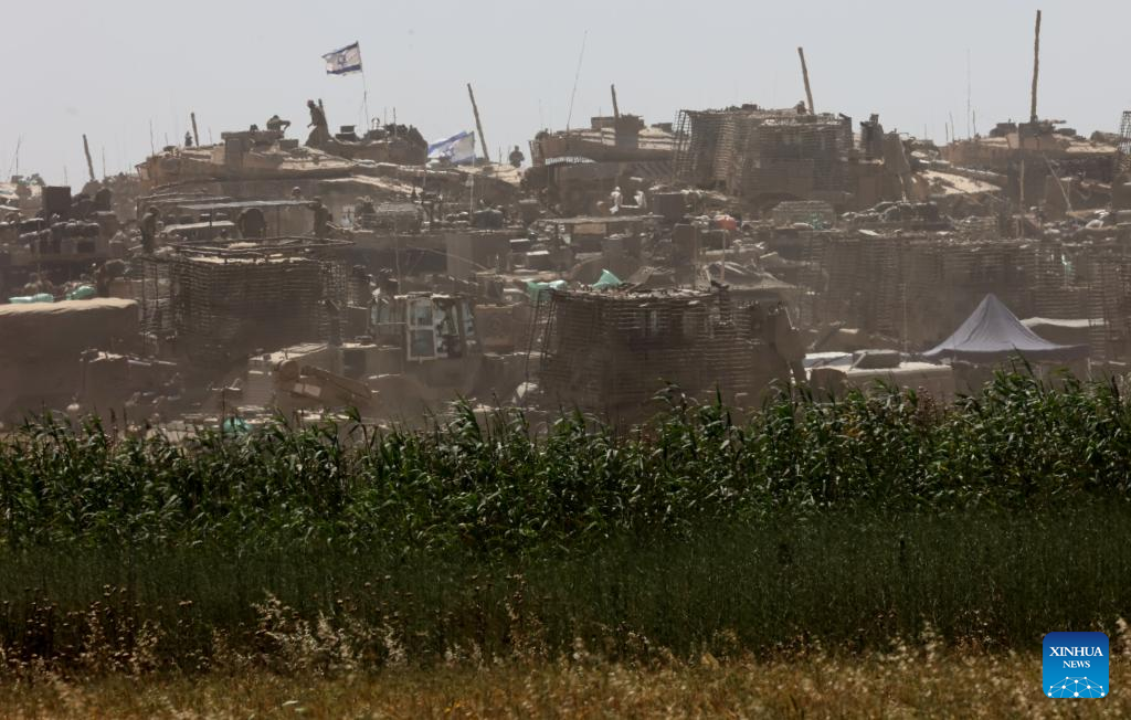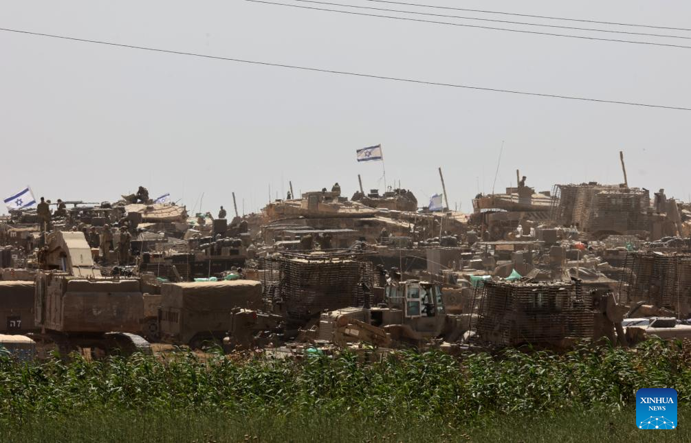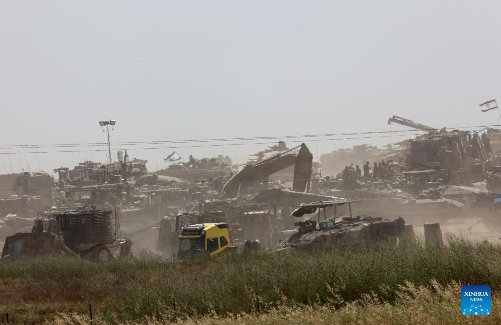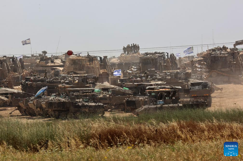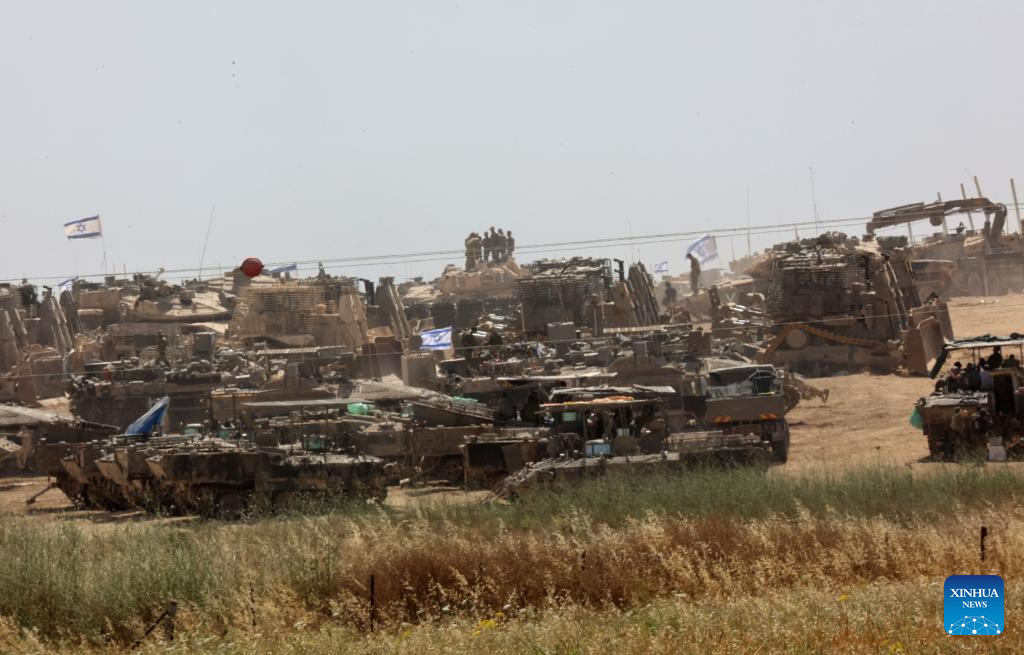 Israeli armored vehicles are deployed near Kibbutz Reim in southern Israel, on May 9, 2024. The Israeli army will continue its operation in the southern Gaza Strip city of Rafah "as planned," after the talks on the Israel-Hamas truce held in Egypt's Cairo collapsed on Thursday, an Israeli official told Xinhua. (Photo by Gil Cohen Magen/Xinhua)