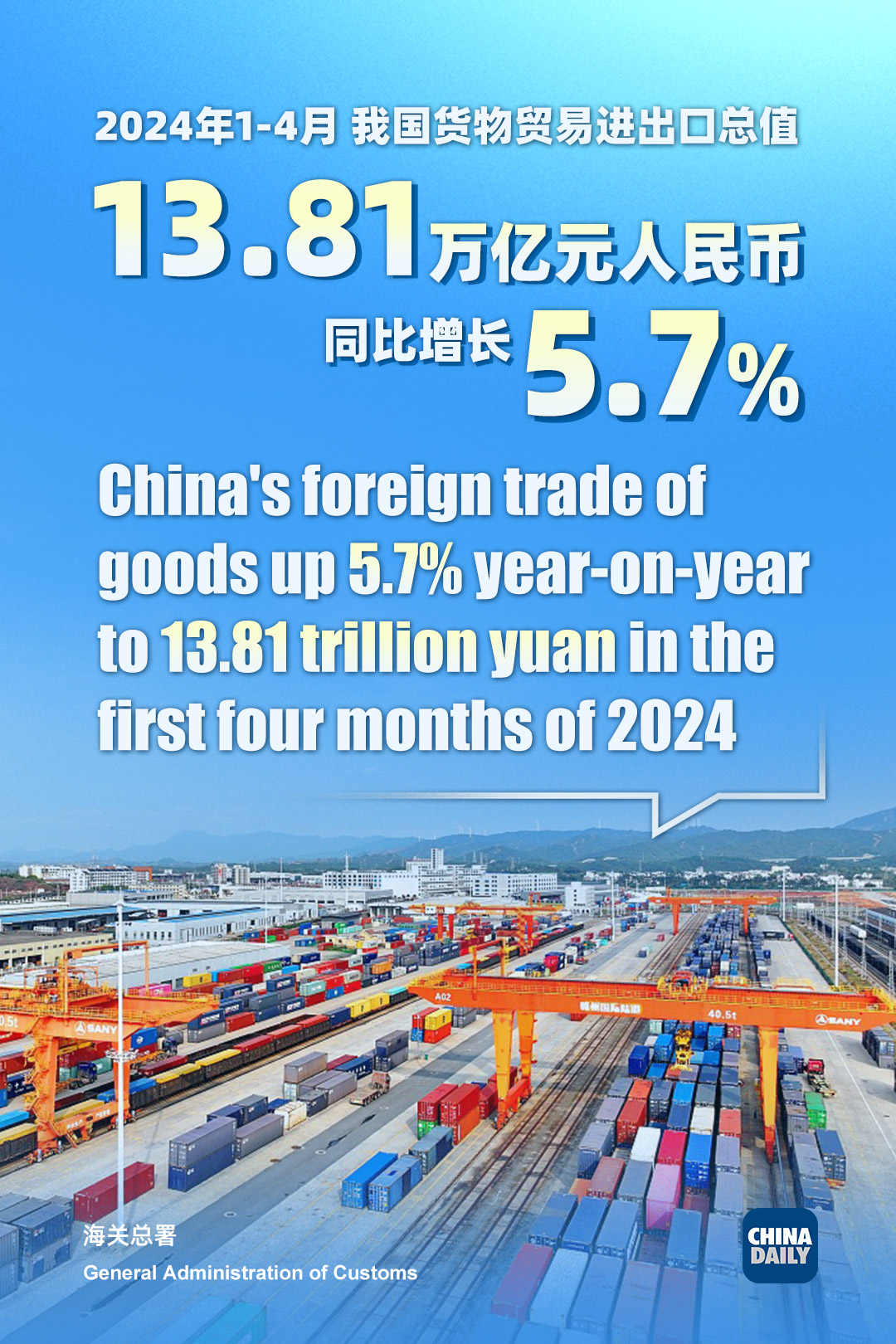 China's total imports and exports of goods expanded 5.7 percent year-on-year in the first four months of this year to 13.81 trillion yuan ($1.91 trillion), data from the General Administration of Customs showed on Thursday.