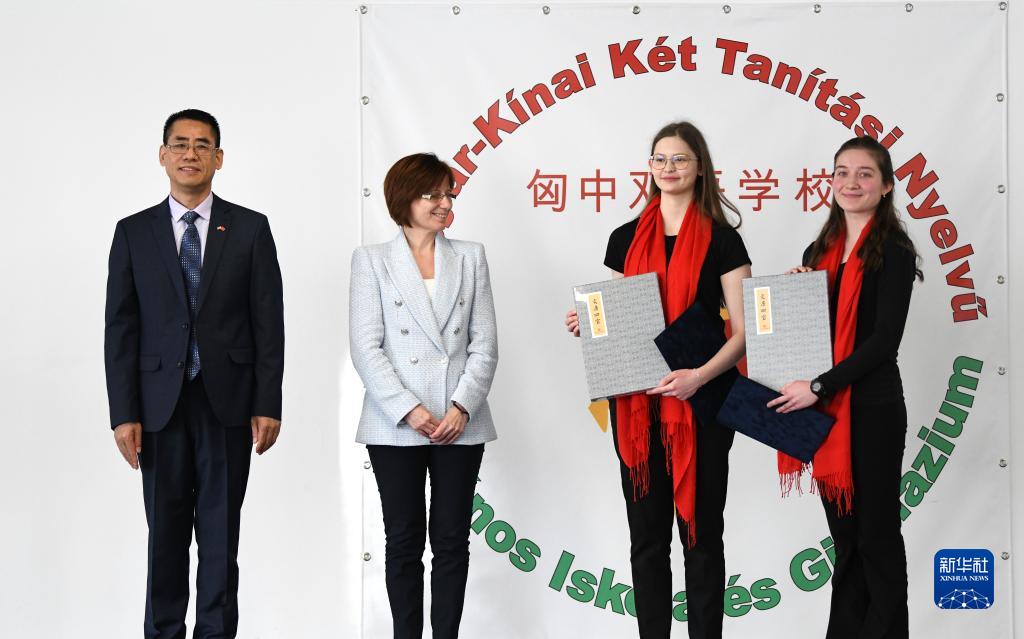 Varga Bonita (1st R) and Imre Tamara (2nd R), two Hungarian students whose Chinese names are Hu Lingyue and Song Zhixiao, receive gifts from the Chinese Embassy in Hungary at the Hungarian-Chinese bilingual school in Budapest, Hungary, Feb. 24, 2023. (Xinhua/Lian Yi)